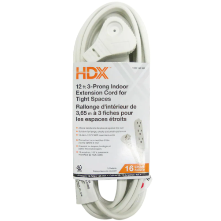 HDX 12 ft. 16 Gauge 13 Amps Indoor Light Duty 3-Prong Extension Cord for Tight Spaces, White